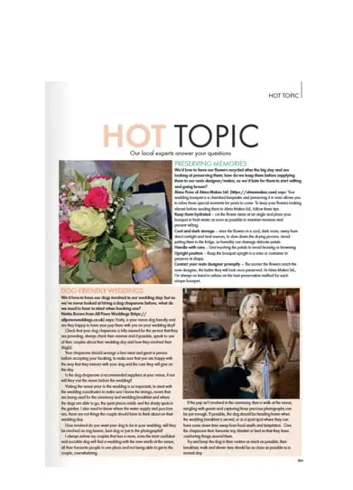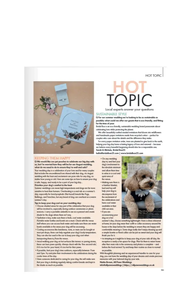 June/July features advice on how to keep your dog cool, comfortable, and safe, if you’re planning a mid-summer wedding and want to ensure your pup stays happy throughout the celebration.